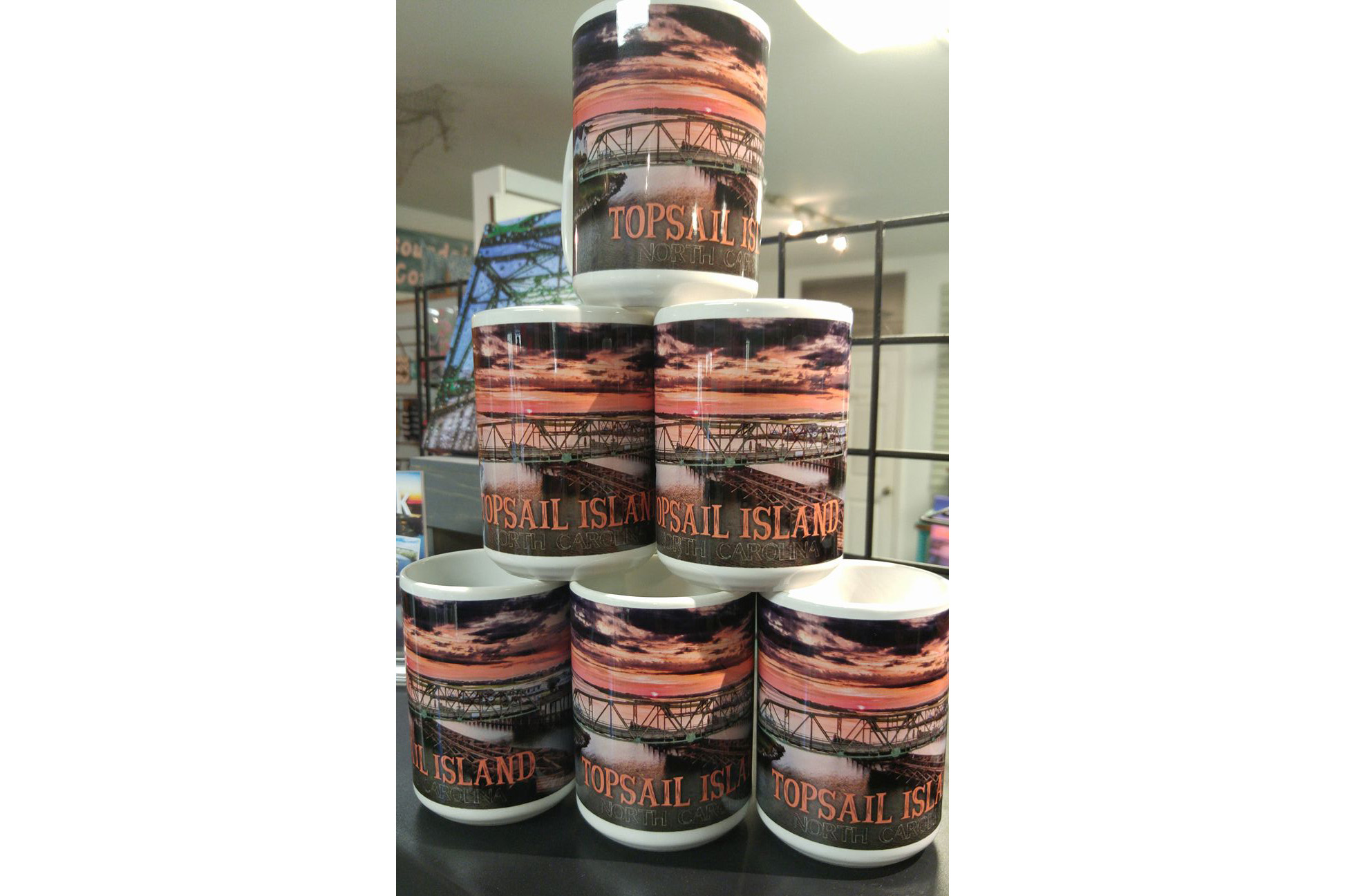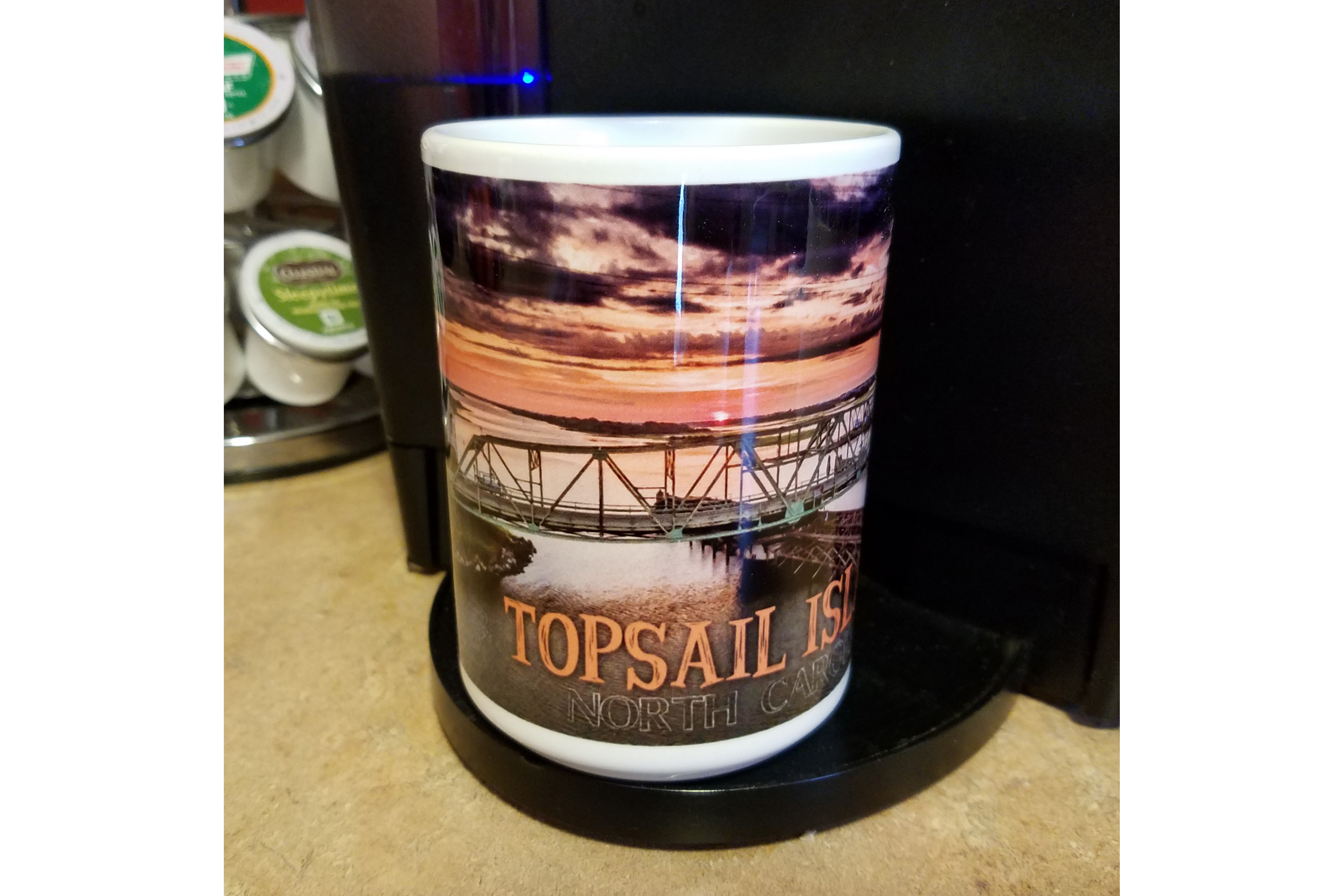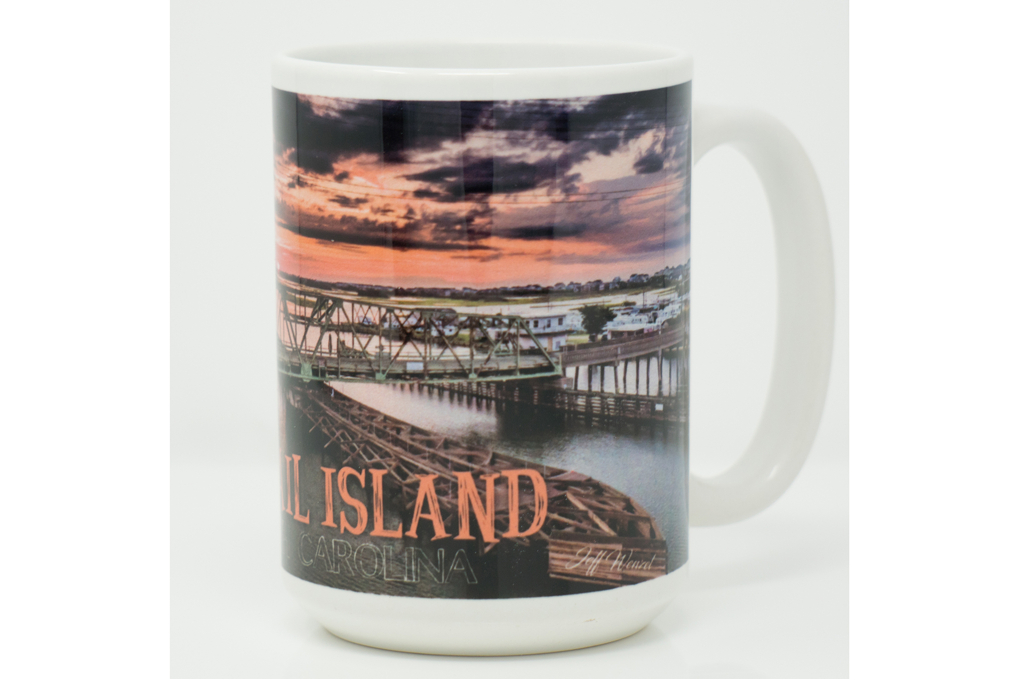Some mugs are pretty and some are functional, this one is both! This 15-ounce ceramic mug is large enough to easily handle the Keurig travel size portion. It also sports large handle for large hands to hold comfortably. Enjoy your morning brew while also enjoying a Jeff Wenzel image of a beautiful sunrise behind the Surf City Swing Bridge. Handwashing is recommended.